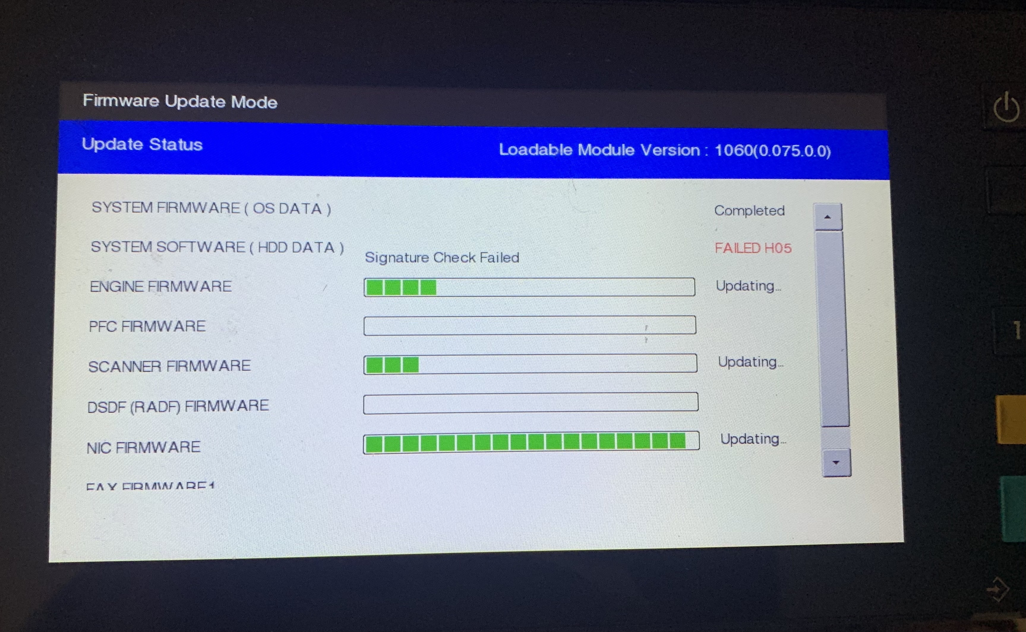 But this update was perfectly fine the last time I tried it?! The hint that came to me was this from the SM: “When H05 error occurs and it does not clear after a USB media check, replace the main